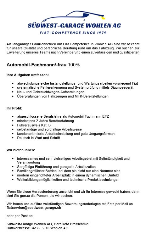 Wir freuen uns auf Ihren Besuch in der Südwest-Garage Wohlen AG an der Büttikerstrasse (Quartier Boll).